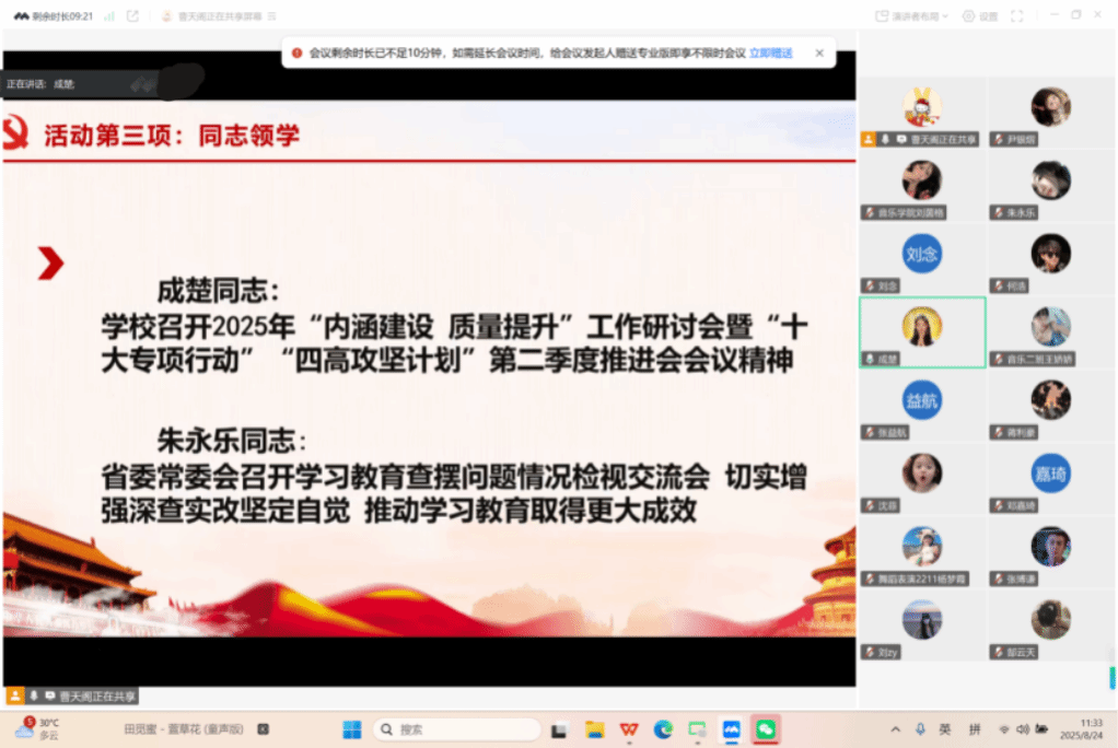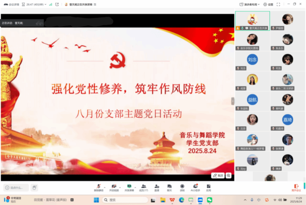 (通讯员 张博谦)2025年8月24日,音乐与舞蹈学院学生党支部通过线上会议方式召开了“强化党性修养,筑牢作风防线”为主题的八月支部主题党日活动。