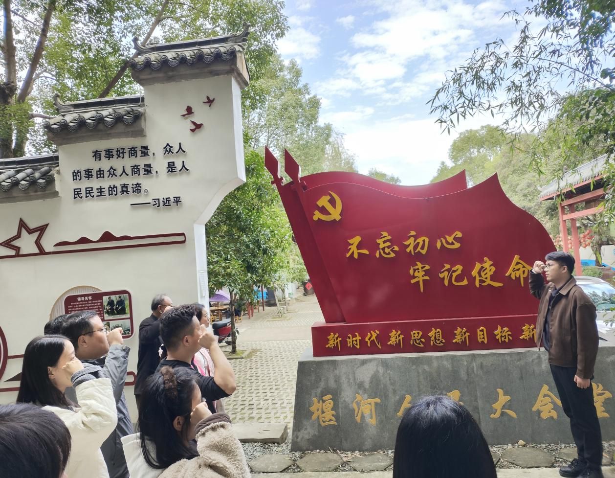 打卡“网红村”,红色故事“看得见”。堰河村可是个“宝藏村”——全国文明村、先进基层党组织、国家4A级景区,还是襄阳市中共党史教育基地!师生们第一站就直奔堰河村史馆。在这里,没有枯燥的说教,只有"“看得见”的奋斗史:一张张泛黄的老照片、一件件带着岁月痕迹的农具,把大家拉回了那个基层党组织带领村民“逆袭”的年代。讲解员口中的“穷山村变美乡村”故事,比任何剧本都更动人。师生们边看边感叹:“原来党建引领不是空话,是真的能带领大伙儿把日子越过越红火!”