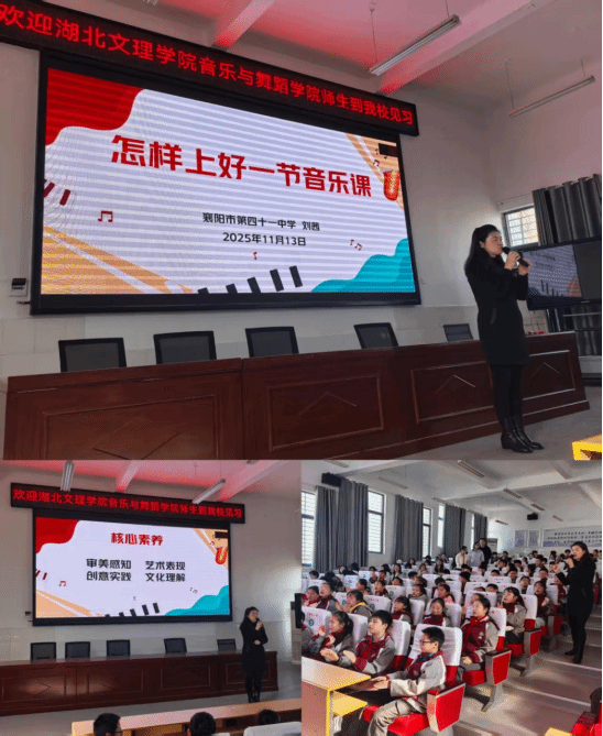 (通讯员:赖媛圆)为深化实践育人,提升师范生教学能力,2025年11月13日,音乐学系组织2023级学生赴襄阳市第四十一中学开展教育见习活动。本次活动采用“课堂观摩+集中评课+专家讲座”三位一体模式,推动学生从“观课”走向“评课”,实现理论与实践的深度融合。