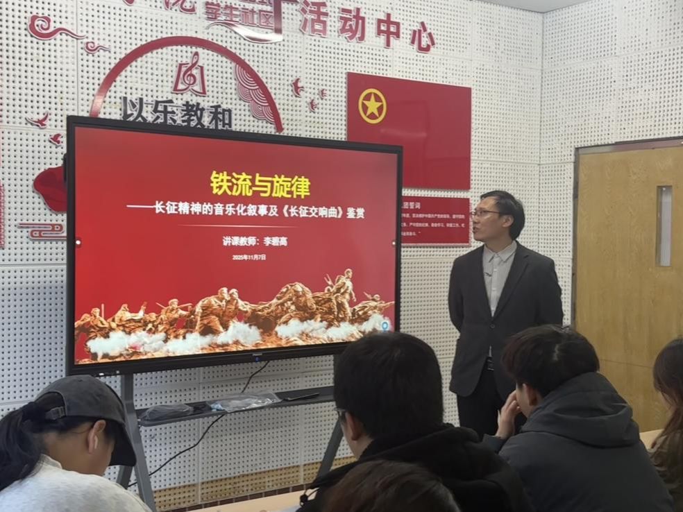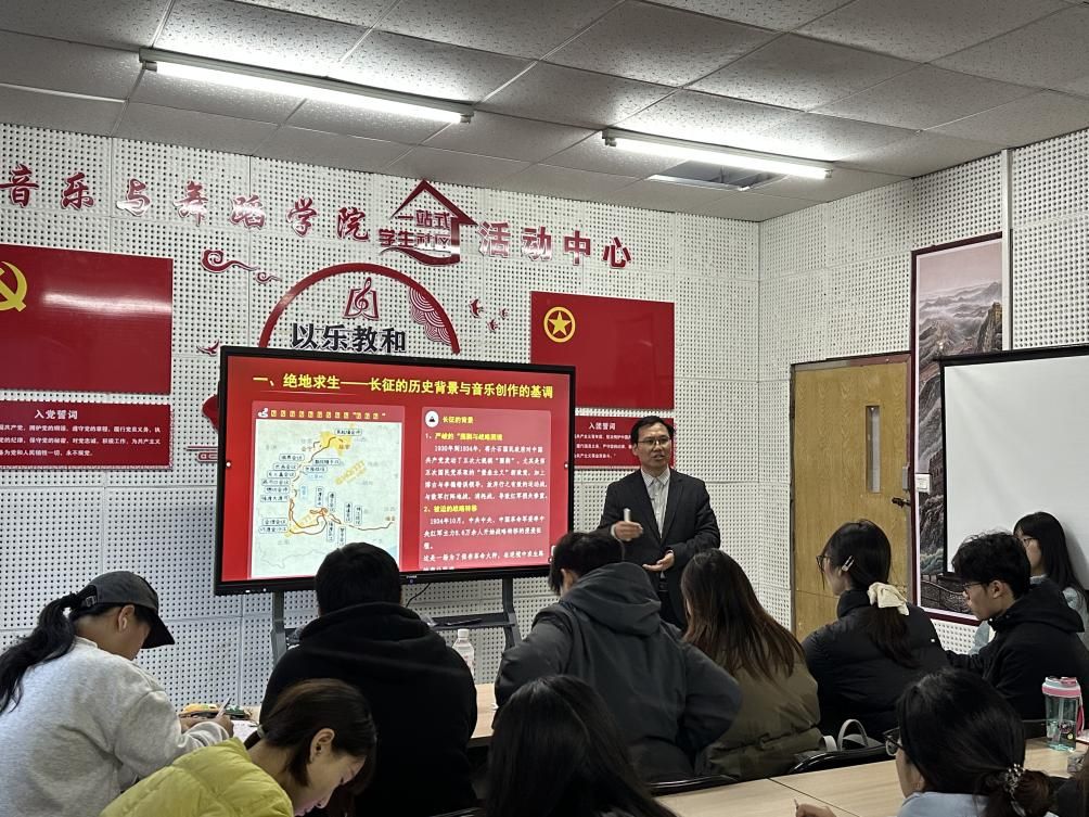 (通讯员 张博谦)为深入推进党史学习教育,引导入党积极分子感悟长征精神的时代伟力,11月7日,音乐与舞蹈学院党支部在S1一站式学生社区成功开展第34期入党积极分子第四次党课。本次党课以“铁流与旋律——长征精神的音乐化叙事及《长征交响曲》鉴赏”为主题,由音乐与舞蹈学院副院长李碧高老师主讲,全体入党积极分子参与学习。