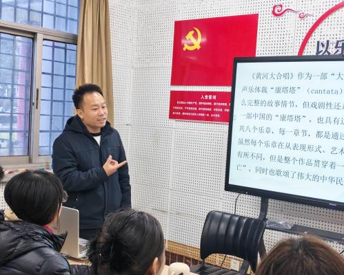 活动伊始,李阳老师结合国家公祭日的历史背景,深情回溯了1937年南京大屠杀的惨痛史实,详细介绍了12月13日国家公祭日的设立初衷与深远意义,强调当代青年应铭记30万遇难同胞的苦难,筑牢历史记忆,坚决抵制历史虚无主义。作为音乐专业教师,李阳老师立足学科特色,聚焦“人民音乐家”冼星海的生平事迹,深入解读其代表作《黄河大合唱》的创作历程与精神内核。从《黄河船夫曲》的抗争呐喊到《黄河颂》的家国豪情,从《黄水谣》的苦难倾诉到《保卫黄河》的磅礴气势,他通过专业的乐章解析、生动的音乐赏析,带领在场师生沉浸式感受这部红色经典中蕴含的民族精神与战斗力量,深刻理解其作为抗战“精神武器”的时代价值,让音乐专业的党性教育更具学科辨识度与感染力。