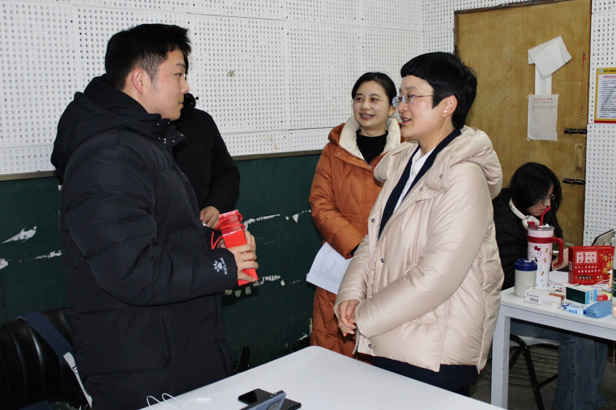 慰问现场暖意融融,秦军荣副校长亲手为每位考研学子送上精心准备的慰问品,随后逐一与大家握手、拥抱,用真挚的举动传递关怀与期许。她叮嘱学子们,学校和学院永远是大家最坚实的后盾,遇到任何问题都可及时向老师求助,学校将全力为大家的备考之路保驾护航。