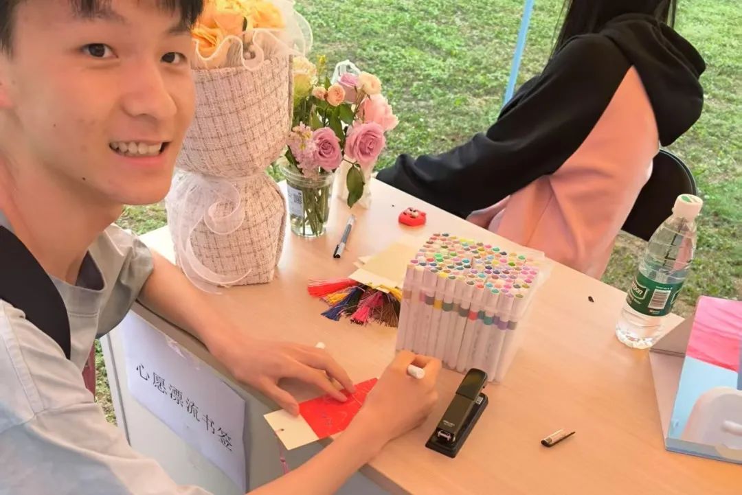 心愿漂流书签区域,同学们在精美书签上书写对自己的期许或给他人的祝福,承载着温暖心意的书签纷纷投入漂流箱。这些文字如 “心灵星光” 般流转,为参与者带来陌生人的惊喜与慰藉,让校园充满温情联结。